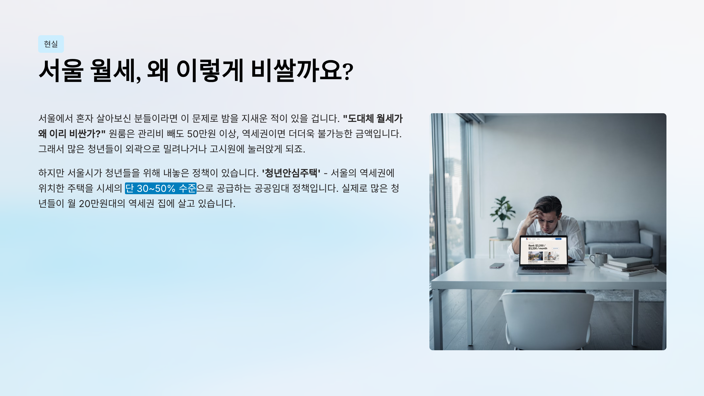 하지만 서울시가 청년들을 위해 내놓은 정책이 있습니다. '청년안심주택' - 서울의 역세권에 위치한 주택을 시세의 단 30~50% 수준으로 공급하는 공공임대 정책입니다. 실제로 많은 청년들이 월 20만원대의 역세권 집에 살고 있습니다.