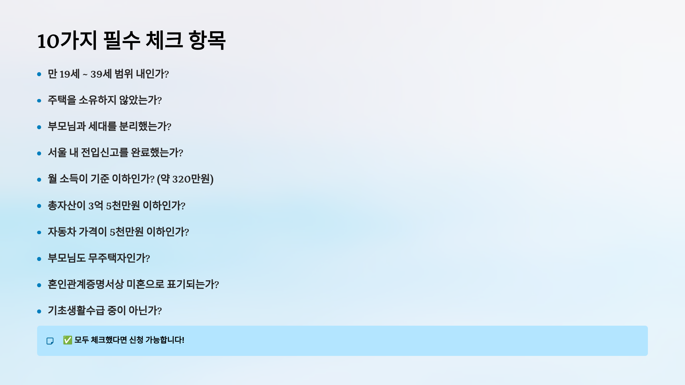 ⚠️ 중요: 본인이 40세 생일이 임박했거나, 재산이 많거나, 부모님이 집을 소유하고 있다면 입주 불가능합니다. 꼭 조건을 확인해야 합니다.