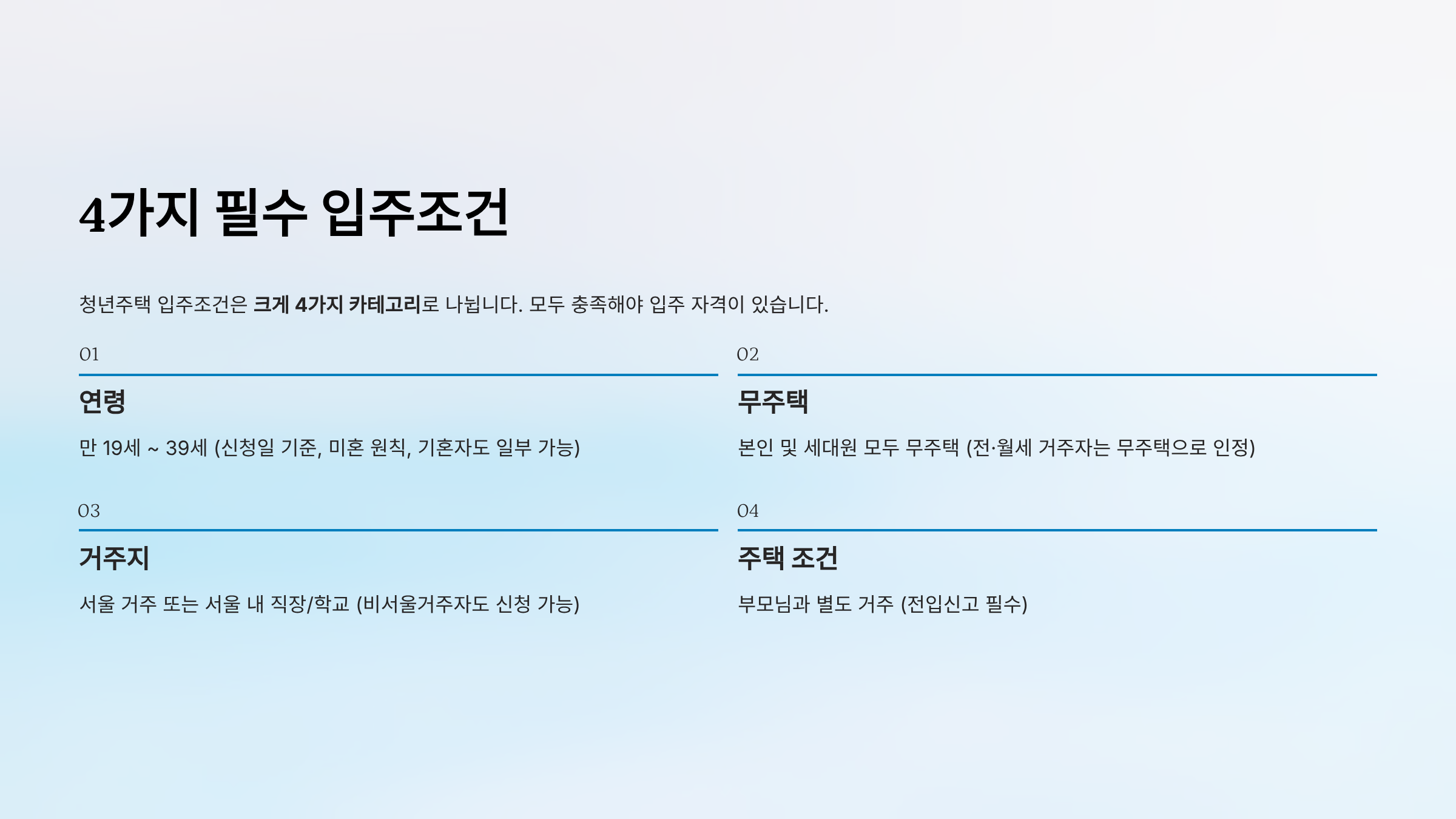 청년주택 입주조건은 크게 4가지 카테고리로 나뉩니다. 모두 충족해야 입주 자격이 있습니다.