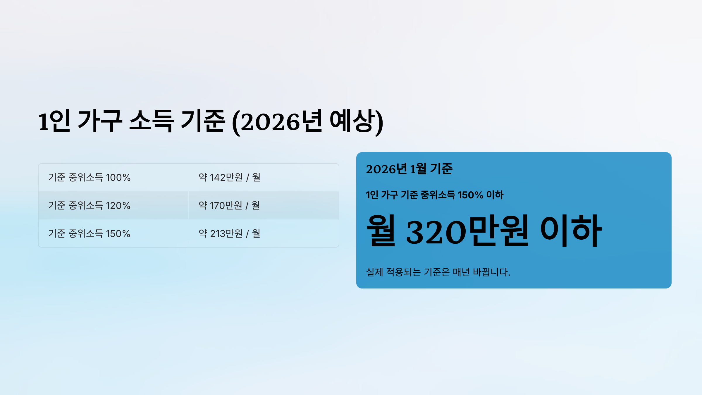 팁: 실제 적용되는 기준은 매년 바뀝니다. 2026년 1월 기준으로 1인 가구 기준 중위소득 150% 이하 약 월 320만원 이하로 예상됩니다.