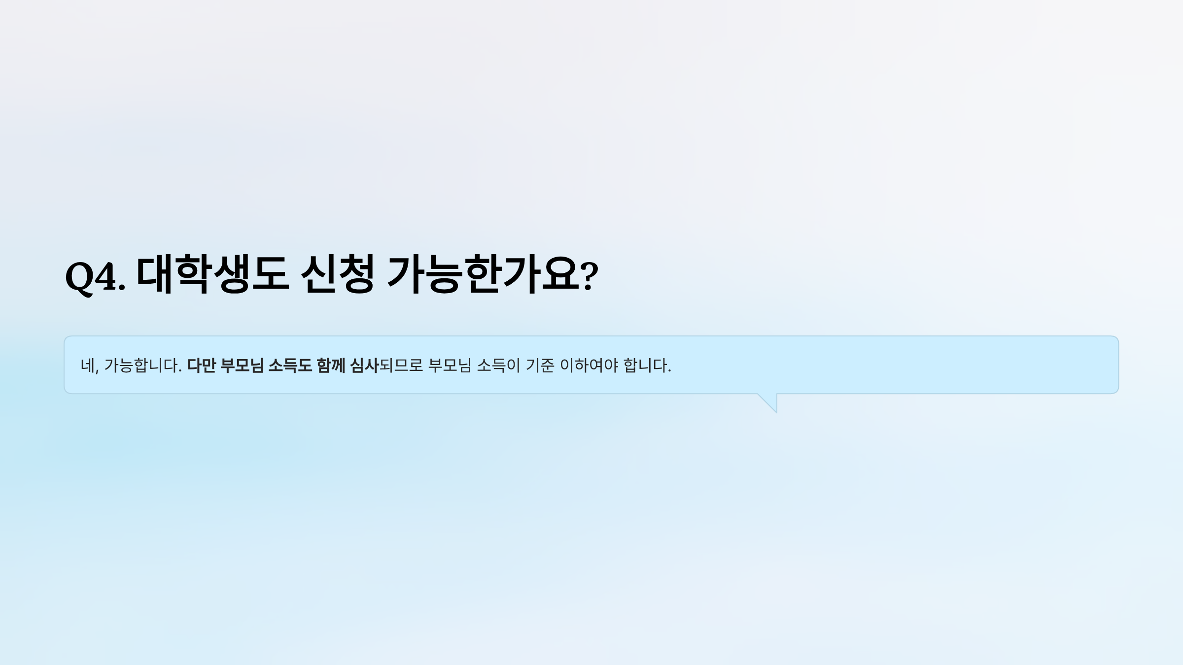 A. 네, 가능합니다. 다만 부모님 소득도 함께 심사되므로 부모님 소득이 기준 이하여야 합니다.