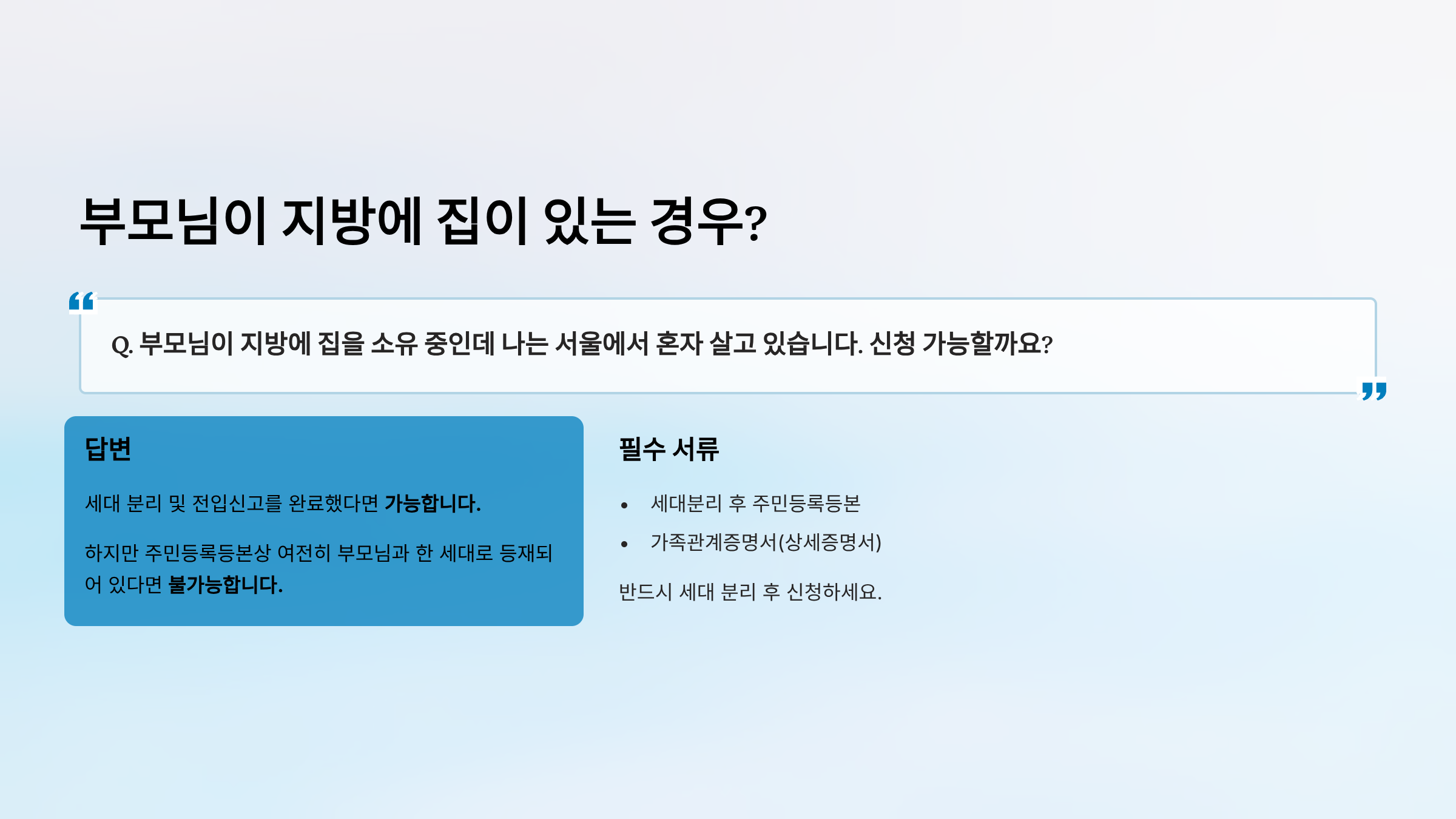 Q. 부모님이 지방에 집을 소유 중인데 나는 서울에서 혼자 살고 있습니다. 신청 가능할까요?