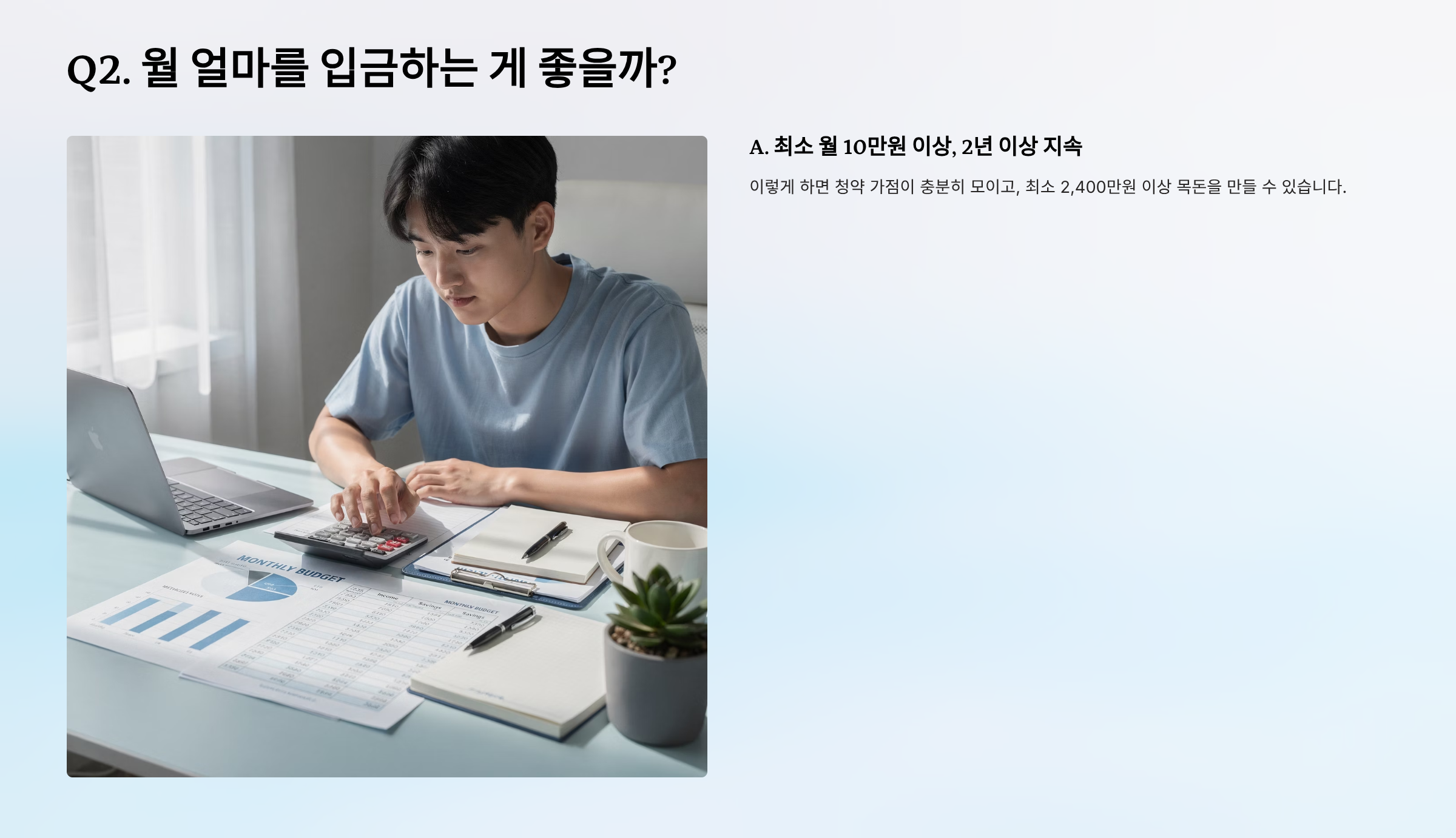A. 최소 월 10만원 이상, 2년 이상 지속 입금을 권장합니다. 이렇게 하면 청약 가점이 충분히 모이고, 최소 2,400만원 이상 목돈을 만들 수 있습니다.