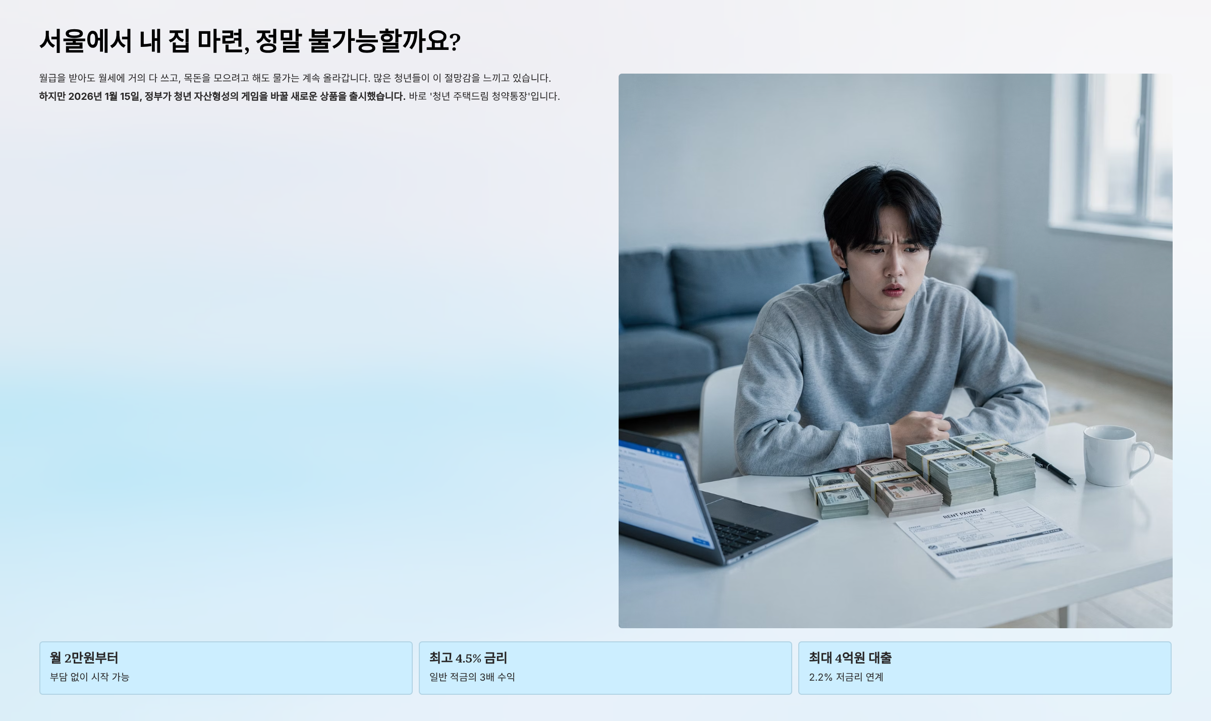 2026년 1월 15일, 정부가 청년 자산형성의 게임을 바꿀 새로운 상품을 출시했습니다. 바로 **'청년 주택드림 청약통장'**입니다. 이 통장은 단순한 적금이 아닙니다. 월 2만원부터 100만원까지 입금하면 최고 4.5%의 금리를 받고, 청약에 당첨되면 2.2% 저금리로 최대 4억원까지 대출받을 수 있는 내 집 마련의 지름길입니다.
