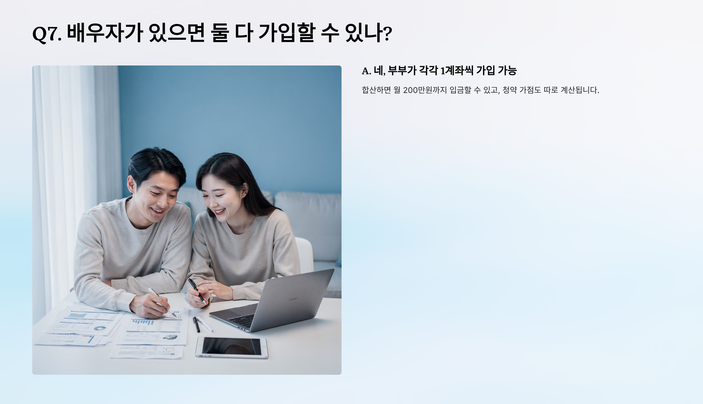 A. 네, 부부가 각각 1계좌씩 가입 가능합니다. 합산하면 월 200만원까지 입금할 수 있고, 청약 가점도 따로 계산됩니다.