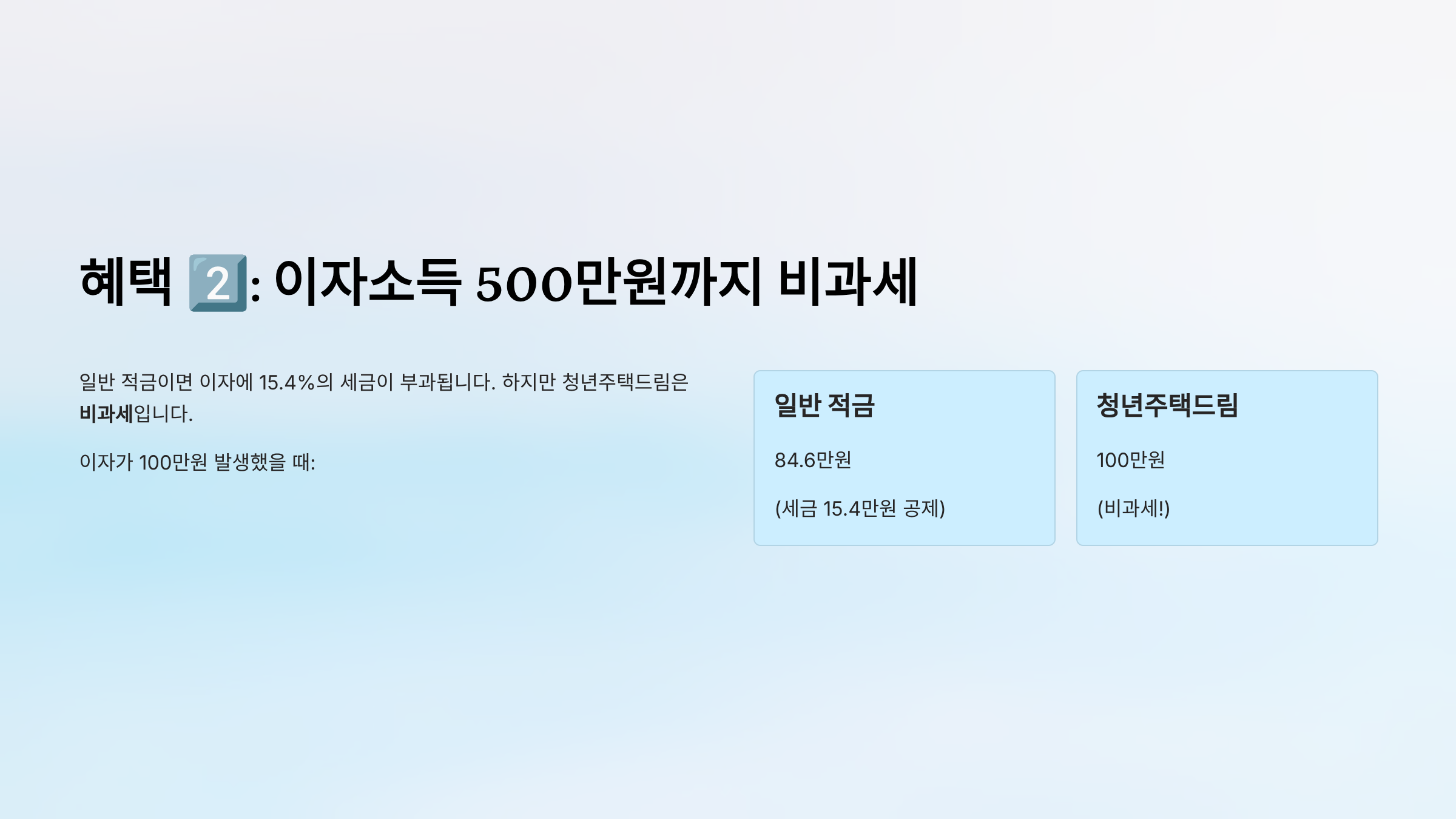 - 일반 적금: 84.6만원 (세금 15.4만원 공제)