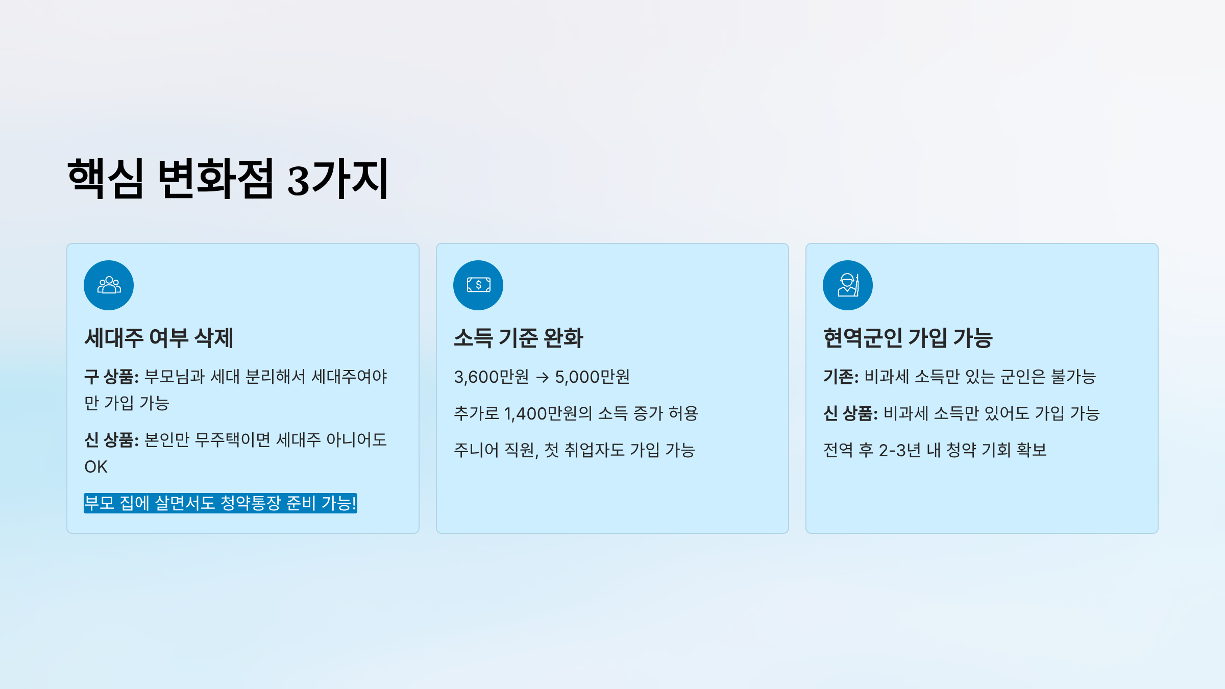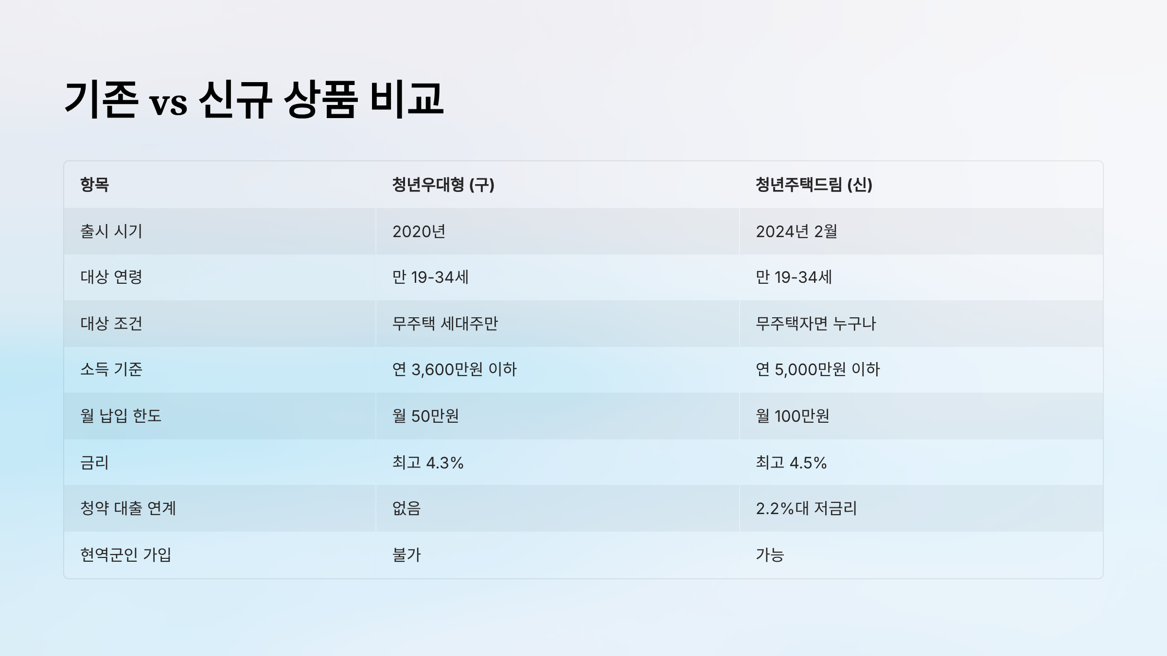 - 구 상품: 부모님과 세대 분리해서 세대주여야만 가입 가능