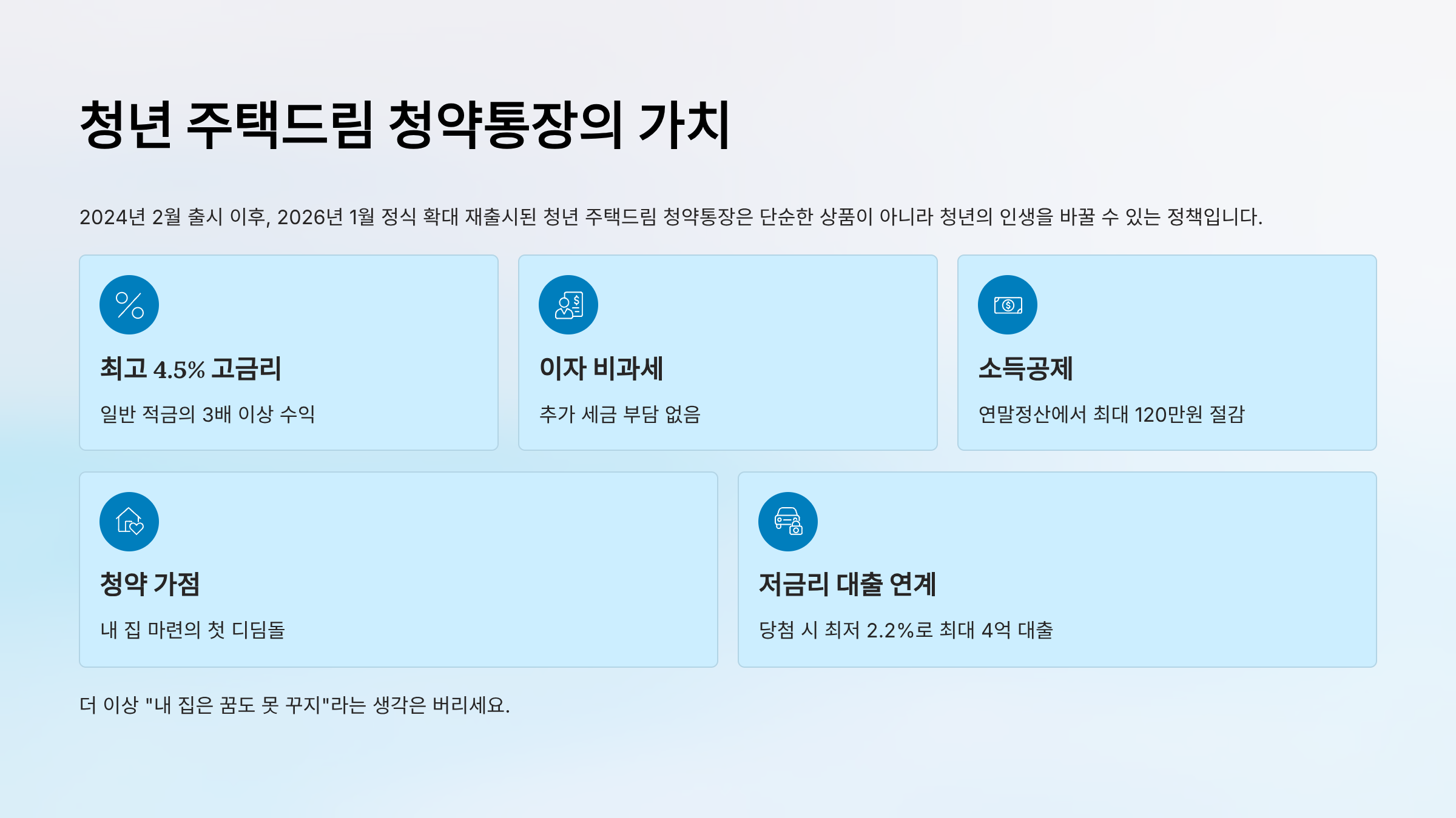 2024년 2월 출시 이후, 2026년 1월 정식 확대 재출시된 청년 주택드림 청약통장은 단순한 상품이 아니라 청년의 인생을 바꿀 수 있는 정책입니다.